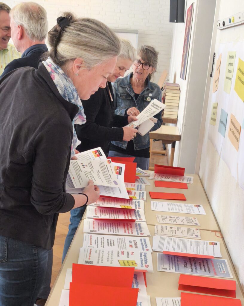 Wir beschränken uns nicht nur auf digitale Angebote. Von Anfang an haben wir bewusst soziale Brennpunkte in Gemeinden aufgesucht, dort unsere Plakatständer und Info-Tische aufgestellt und über Poster und Flyer zu aktuellen Themen das Gespräch mit den Passanten gesucht. Wir waren zum Beispiel auf dem Markt in Freiburg-Weingarten und Freiburg-Landwasser, in der Freiburger Fußgängerzone und in Umlandgemeinden. Dabei kam es zu intensiven Gesprächen mit Menschen, die uns angesprochen oder die wir in Diskussionen einbezogen haben. Am interessiertesten waren alte Menschen, die über ihre Erfahrungen mit Krieg und Diktatur sprachen, so in der DDR oder Rumänien, oder sehr junge Leute, die unsere Poster neugierig gemacht hatten. Auch Menschen, die als Gastarbeiter oder Geflüchtete zu uns kamen und ein positiveres Bild vom demokratischen Deutschland hatten als z.B. die AfD, erzählten uns von ihren Erlebnissen. Oft waren wir nur Zuhörende und bekamen so erhellende Einblicke in Biographien und politische Entwicklungen. Demgegenüber wogen Pöbeleien und verbale Attacken Einzelner gering.