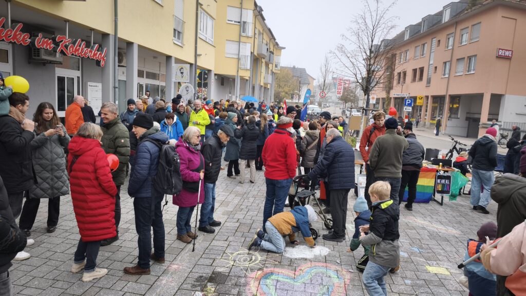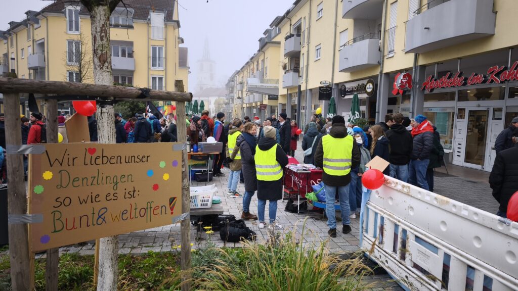 Am Samstagvormittag, 8. November 2025, versuchten Mitglieder der AfD mit einem Stand am Denzlinger Kohlerhof auf sich aufmerksam zu machen. Ihnen gegenüber standen zahlreiche Menschen aus Denzlingen, Freiburg, Waldkirch und Umgebung und zeigten Präsenz für ein buntes, weltoffenes, Zusammenleben. Mit Plakaten, Infos, Fahnen, Aufklebern, Kuchen, Popcorn, Spielen für Kinder und viel Diskussionsbereitschaft. Mit von der Partie war natürlich auch unsere Bürgerinitiative für Toleranz und Demokratie. Als gegen Mittag die Blauen ihr Material zusammenpackten und gingen, kamen von den Bunten Rufe „Wir bleiben“.
